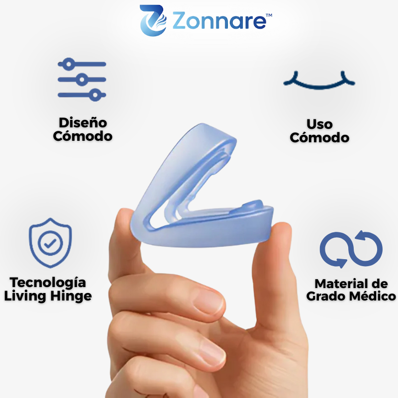 El Zonnare™ cuenta con tecnología "Living Hinge" que permite movimiento natural de la mandíbula. Puedes hablar, beber agua y mover la boca libremente durante toda la noche.